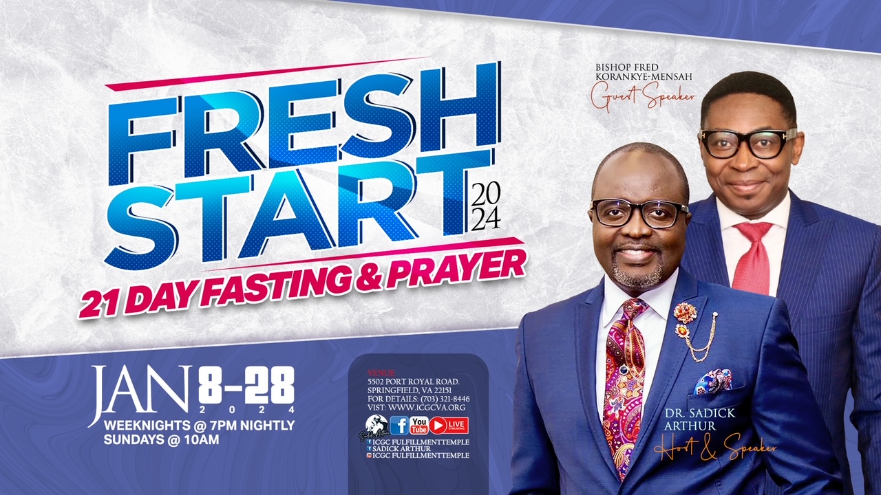We are fasting and praying intensely, nightly for 21 days, from January 8th to 28th. It’s our Daniel Fast. No carbohydrates, no meat, no dairy products, no fried food for 21 days. A commitment to join the body of believers nightly to pray.