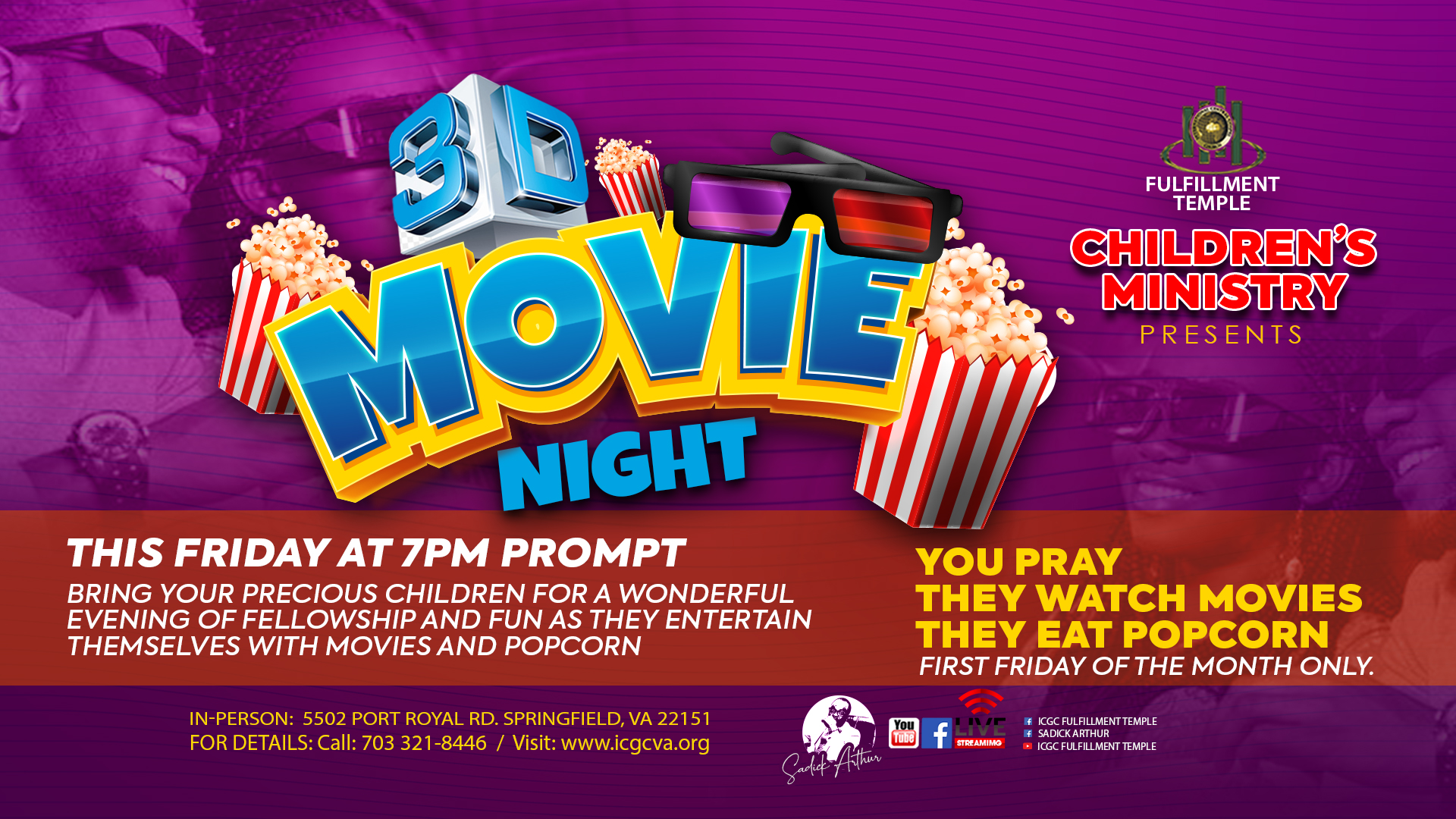Bring your precious children for a wonderful evening of fellowship and fun as they entertain themselves with movies and popcorn. You pray. They watch movies. That eat popcorn. Every first Friday of the month.