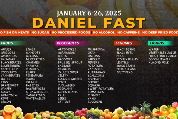The 3-week challenge of healthy eating and strong spirit is January 6th to 26th 2025. We are fasting and praying intensely for 21 days. It’s our Daniel Fast. No carbohydrates, no meat, no dairy products, no fried food for 21 days. We break the fast with salad, vegetables, and/or fruits. Daniel...