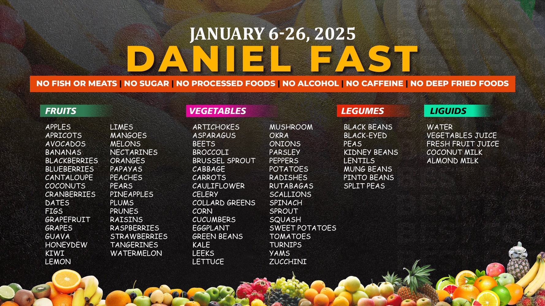 The 21-day challenge of healthy eating, fasting and intense daily prayers is from January 6th to January 26th. It’s The Daniel Fast: No carbohydrates, no meat, no dairy products, no fried food for 21 consecutive days. Only greens, vegetables and fruits. Let’s eat right.