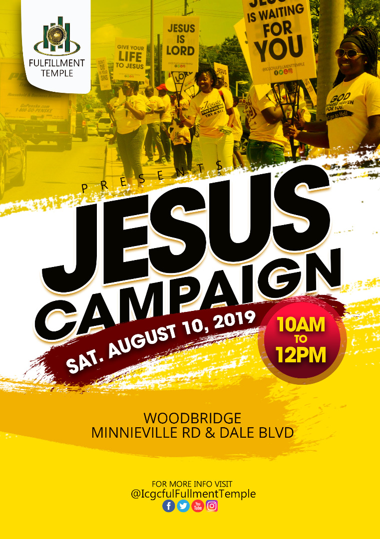 This Saturday is our August edition of Jesus Campaign. We are storming Woodbridge with JESUS. It is all about evangelism, soul winning, outreach, and witnessing.