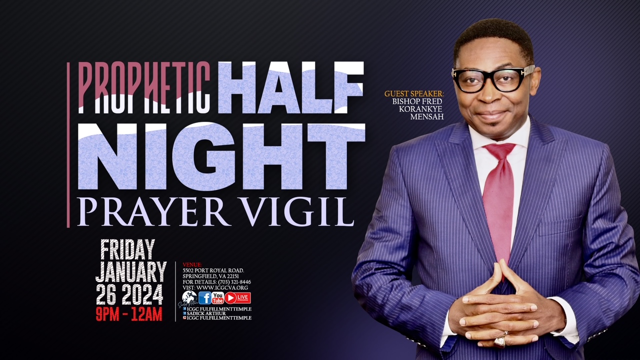 The first edition of the 2024 end-of-the-month Prophetic Half Night Prayer Vigil is this Friday, January 26, 2024 at 9PM. Come with your family as we connect with God through a time of intense, spiritually refreshing prayer. Guest Speaker: Bishop Fred Korankye Mensah.