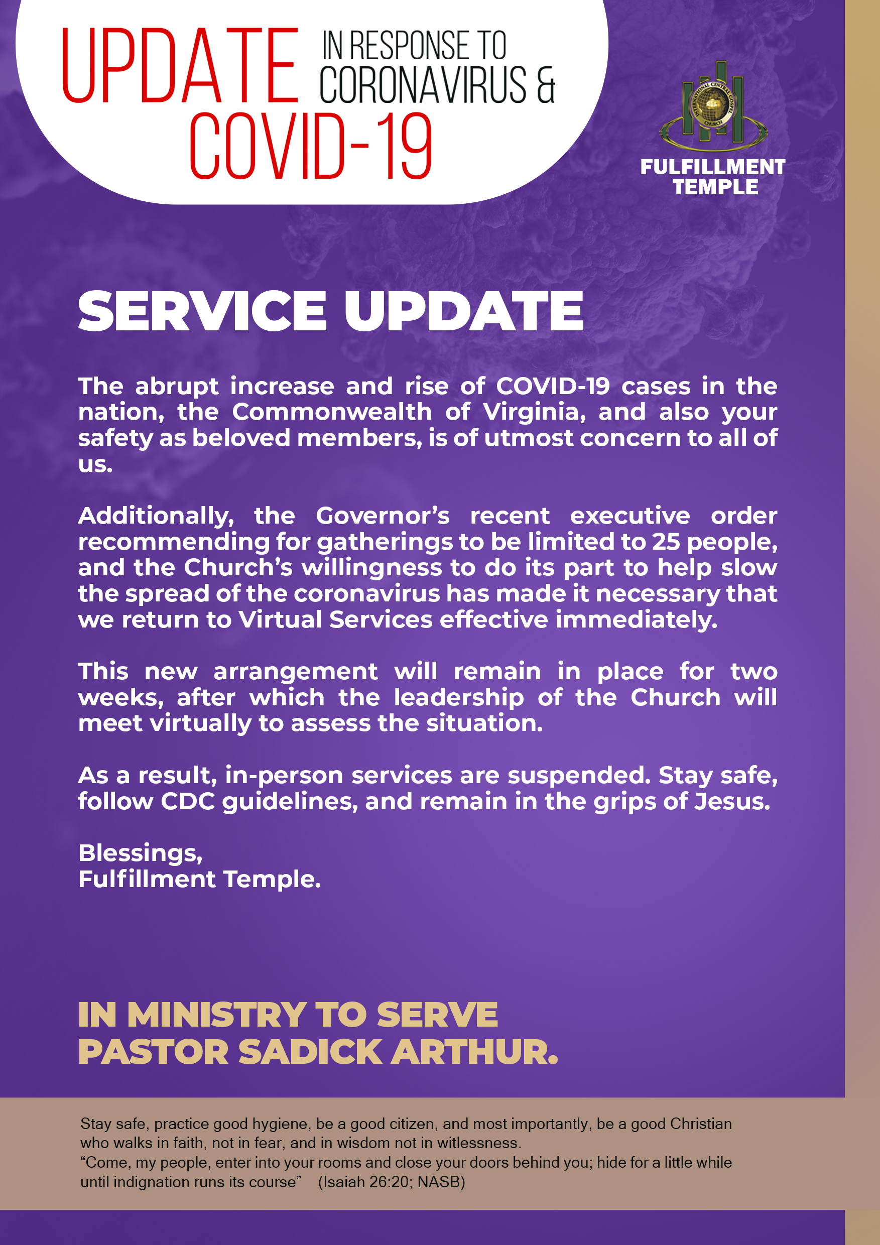 Posted on December 5, 2020 Posted By: ICGCVA Editor Categories: Announcements In person services are suspended until January 3rd 2021. Worship live with us online.