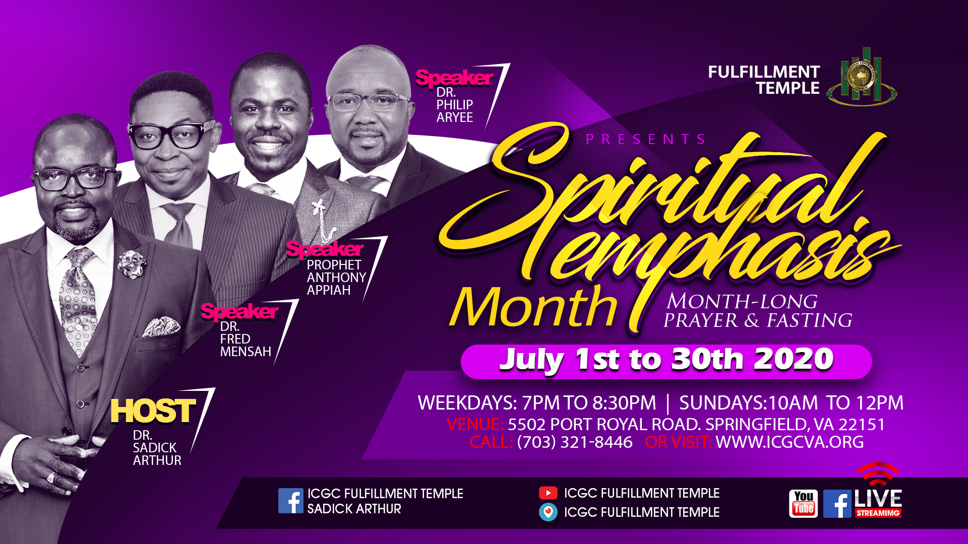 30 days of fasting and intense prayers this July to start the second half of the year. Direction of the fast: (1) Supernatural recovery and restoration, (2) Supernatural sustenance and increase, and (3) Supernatural preservation. Morning prayers on the Conference Call at 5:30am and evening services at the church at 7pm.