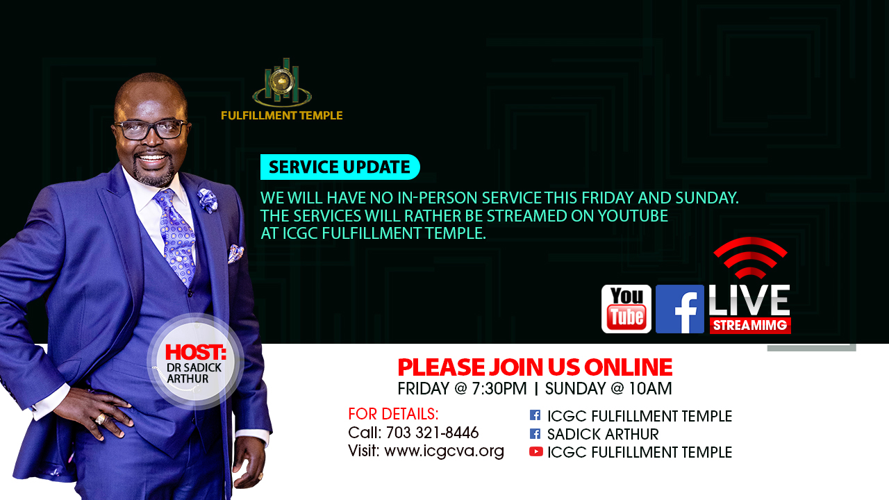 Until January 3rd 2021, we are streaming our services live on our website, Facebook, YouTube, and Periscope using ICGC Fulfillment Temple handles. All in-person services are suspended.